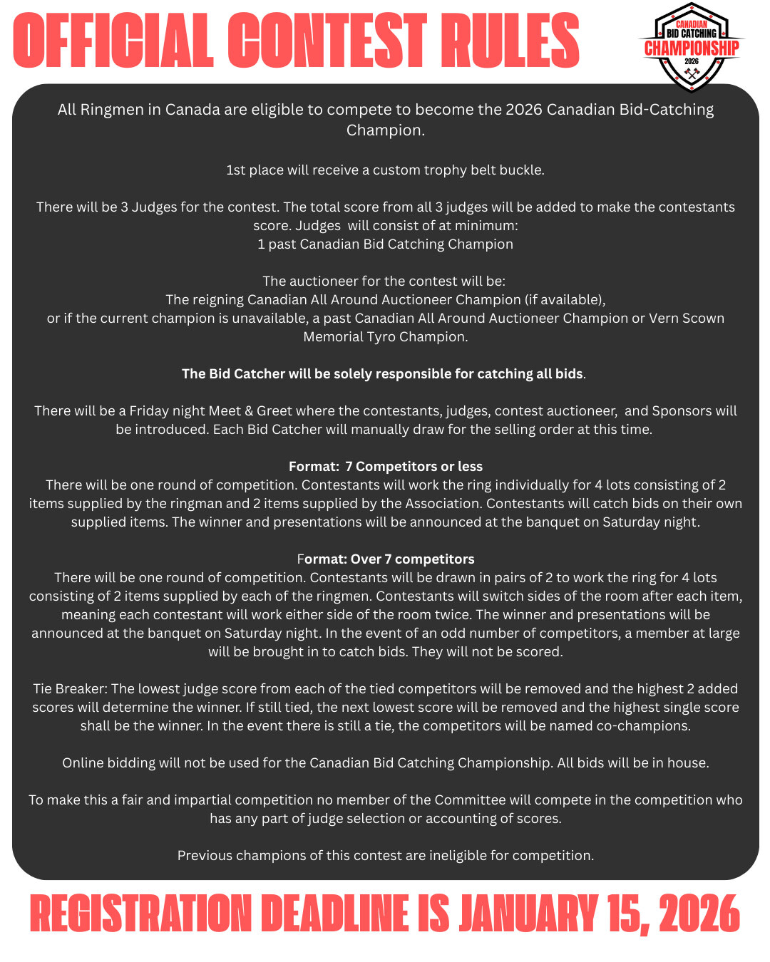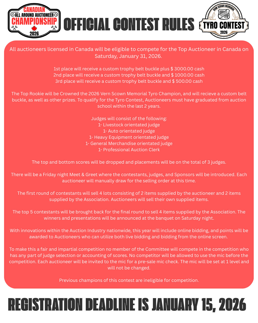 2026 Canadian All Around Auctioneer Championship, Canadian Bid Catching Championship, and Vern Scown Memorial Tyro Contest